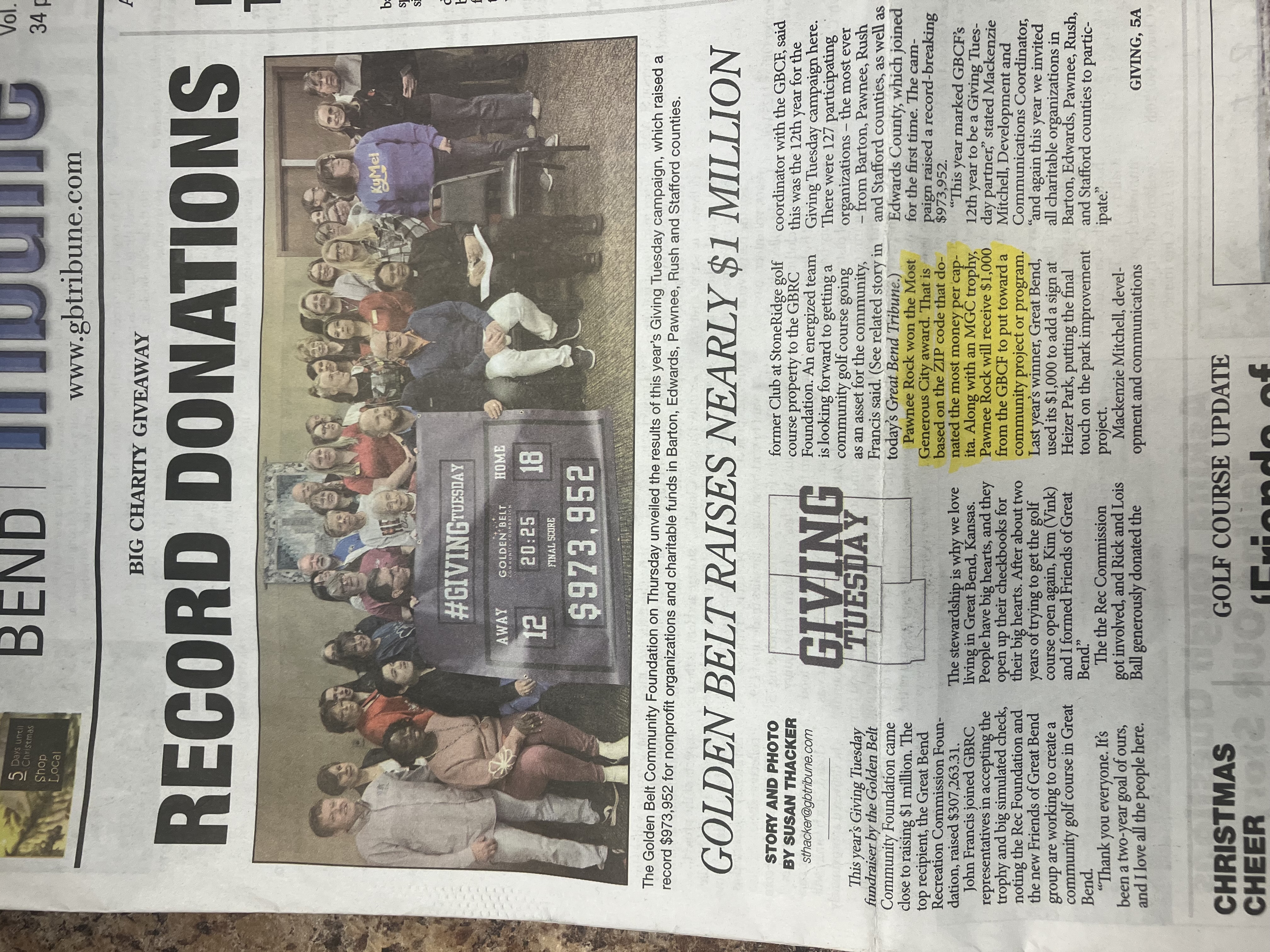 The Golden Belt Community Foundation held their award ceremony for Giving Tuesday this morning. While many charities received large donations, Pawnee Rock won the Most Generous City Award, along with a check for $1000 to put toward an upcoming community project.
